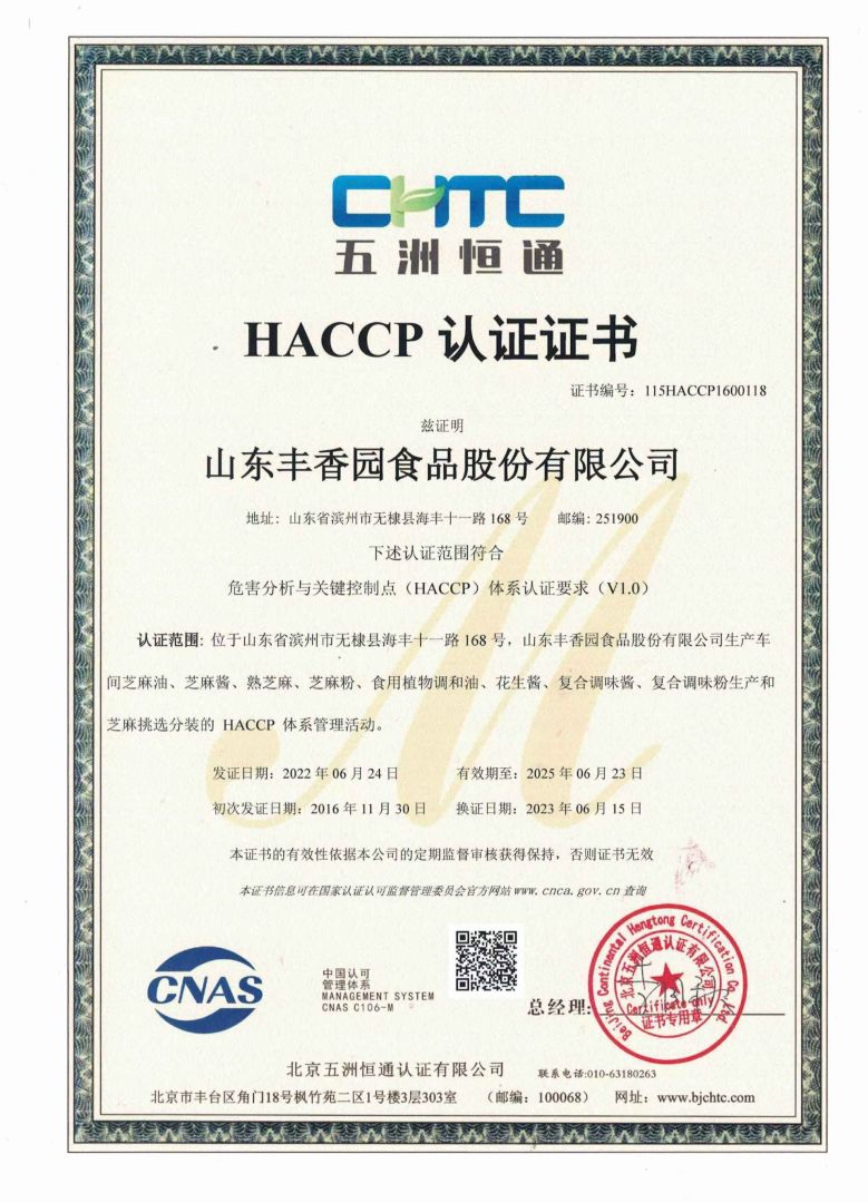 山東豐香園食品股份有限公司位于山東省濱州市無棣縣海豐十一路168號,公司擁有員工50多人,年銷售收入6000多萬元,是華北地區最大的純正芝麻香油、芝麻食品定制代加工生產、出口基地。 ? ? 豐香園小磨香油、芝麻調和油、花生醬、芝麻醬、混合醬、熟芝麻制品均已通過英國零售商協會BRC認證、歐盟 美國和國內有機、HACCP體系認證,是山東省出口食品備案企業。 ? ? 豐香園小磨香油、芝麻香油、芝麻醬以傳統石磨工藝精制而成,從原料進庫到成品出廠,經過12道工序嚴格檢測,確保了產品符合國家標準和出口標準,讓廣大消費者吃的放心,吃的營養,吃的健康,豐香園公司致力于打造中國純正芝麻香油、芝麻醬領導品牌。? ? 在歷史和未來之間,“豐香園”一直是純真香油的誠信領導者,豐香園芝麻食品公司用良心磨油,拒絕摻假,每一滴芝麻油都是純正的,被廣大消費者頌有“無棣特產黃金油”,“魯北瓊漿”的美譽。 ? ? 作為中國一家專業生產小磨芝麻香油、芝麻醬的現代化企業,豐香園芝麻香油秉承“真色、真味、真香”的三真級行業新標準,始終走在行業標準的前列。從芝麻采購、驗收檢測、生產、包裝、銷售,一體化產業鏈,真正做到無污染。? ? 豐香園芝麻食品定制代加工產品,已覆蓋山東、兩廣、京津唐、東北及華南地區,出口到日本、韓國、及東南亞等國家和地區。